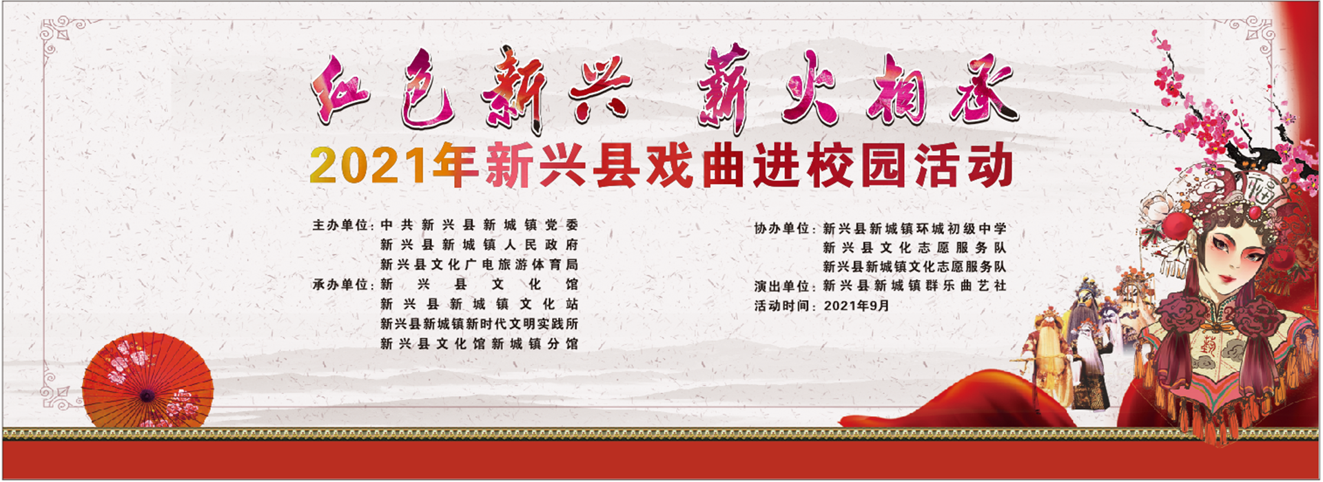 为引导广大师生坚定文化自信,弘扬优良传统,同时推动中华优秀传统文化在校园内的传播和普及,传承红色基因,展现戏曲魅力。由中共新兴县新城镇党委、新兴县新城镇人民政府、新兴县文化广电旅游体育局主办,新兴县文化馆、新城镇文化站、新城镇新时代文明实践所、新兴县文化馆新城镇分馆承办,新兴县文化志愿服务队、新兴县新城镇文化志愿服务队协办的“红色新兴 薪火相承--2021年新兴县戏曲进校园活动”,从2021年9月7日至今,分别走进新城镇环城中学、新城镇西街小学、新城镇中心小学。