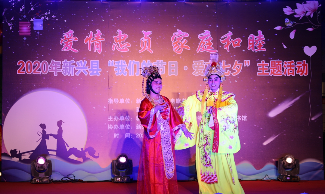 “七夕节”是中华民族的传统节日,2006年被列入第一批国家级非物质文化遗产名录。为了保护和传承好这一非物质文化遗产,充分发挥传统节日在弘扬中华民族优秀文化和加强公民思想道德建设中的载体作用,教育和引导广大干部群众树立正确的爱情观、婚恋观,促进家庭和睦、社会和谐。2020年8月25日(农历七月初七)晚,由新兴县文化广电旅游体育局 、新兴县精神文明建设委员会办公室指导,新兴县文化馆、新兴县博物馆 、新兴县图书馆主办,新兴县文化志愿服务队协办,在县博物馆、图书馆门前开展“爱情忠贞 家庭和睦”-2020年新兴县“我们的节日 爱在七夕”主题活动。