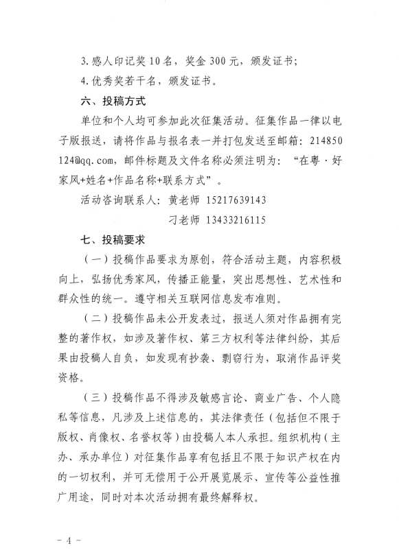 征集作品一律以电子版报送,请于2022年9月30日前将作品与报名表一并打包发送至邮箱:yfqyg@126.com,邮件标题及文件名称必须注明为:“在粤•好家风+姓名+作品名称+联系方式”。