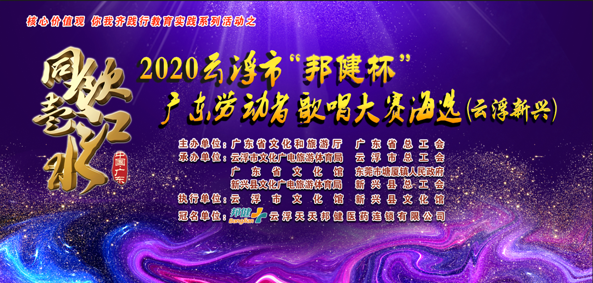 为培育和践行社会主义核心价值观,坚定文化自信,丰富广大群众文化生活,满足劳动者日益增长的文化需求,增强劳动者的幸福感、获得感、归宿感,推进云浮全域融湾发展,开创云浮高质量发展新局面、打造“两新一前列”和实现“美丽云浮·共同缔造”战略目标提供强大的精神动力和营造良好的文化氛围,由广东省文化和旅游厅、 广东省总工会主办,云浮市文化广电旅游体育局、云浮市总工会、广东省文化馆、东莞市塘厦镇人民政府,新兴县文化广电旅游体育局、新兴县总工会承办,云浮市文化馆、新兴县文化馆执行,云浮天天邦健医药连锁有限公司冠名的“同饮一江水-2020年广东劳动者歌唱大赛(云浮新兴)赛区海选”,于近日在新兴县文化馆经过两场角逐,终于决出前三甲及五位优秀奖。