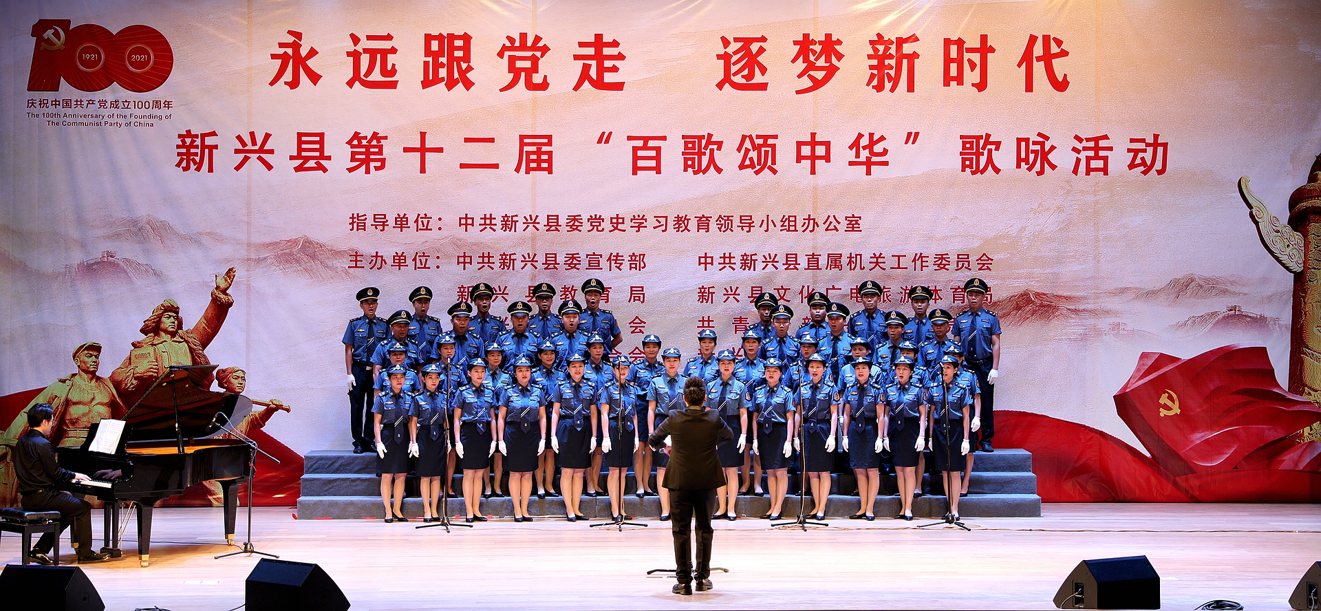 6529人为庆祝中国共产党成立100周年,讴歌中国共产党百年光辉历程和伟大成就,2021年5月10日-11日,新兴县在惠能广场报告厅举行“永远跟党走 逐梦新时代”第十二届‘百歌颂中华’歌咏活动选拔赛。本次歌咏比赛由县委党史学习教育领导小组办公室指导,县委宣传部、县直工委、县教育局、县文广旅体局、县总工会、团县委、县妇联、县文联联合主办,县文化馆承办。比赛分为合唱选拔赛和歌手选拔赛,共举办合唱选拔赛两场、歌手选拔赛一场。